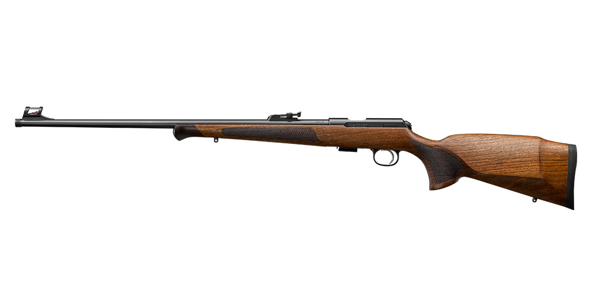 Um modelo que vai impressionar todos os amantes de rifles de caça de uma forma clássica. A coronha com apoiador de bochecha e uma ponta com material decorativo é feito de noz premium. O cano de 630 mm de paredes finas tem uma rosca de boca de 1 / 2×20, uma mira traseira tangente e uma mira frontal de fibra ótica.